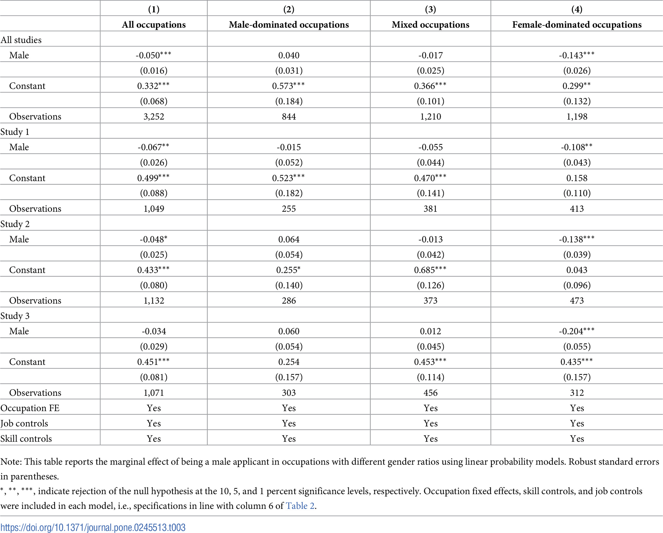 Мы обнаружили, что этот разрыв обусловлен ответами работодателей в профессиях с преобладанием женщин. В профессиях с преобладанием мужчин вероятность получения положительного ответа работодателя была примерно вдвое ниже, чем для женщин. В профессиях с преобладанием мужчин и смешанных профессиях мы не обнаружили значимых различий в положительных ответах работодателей между мужчинами и женщинами.