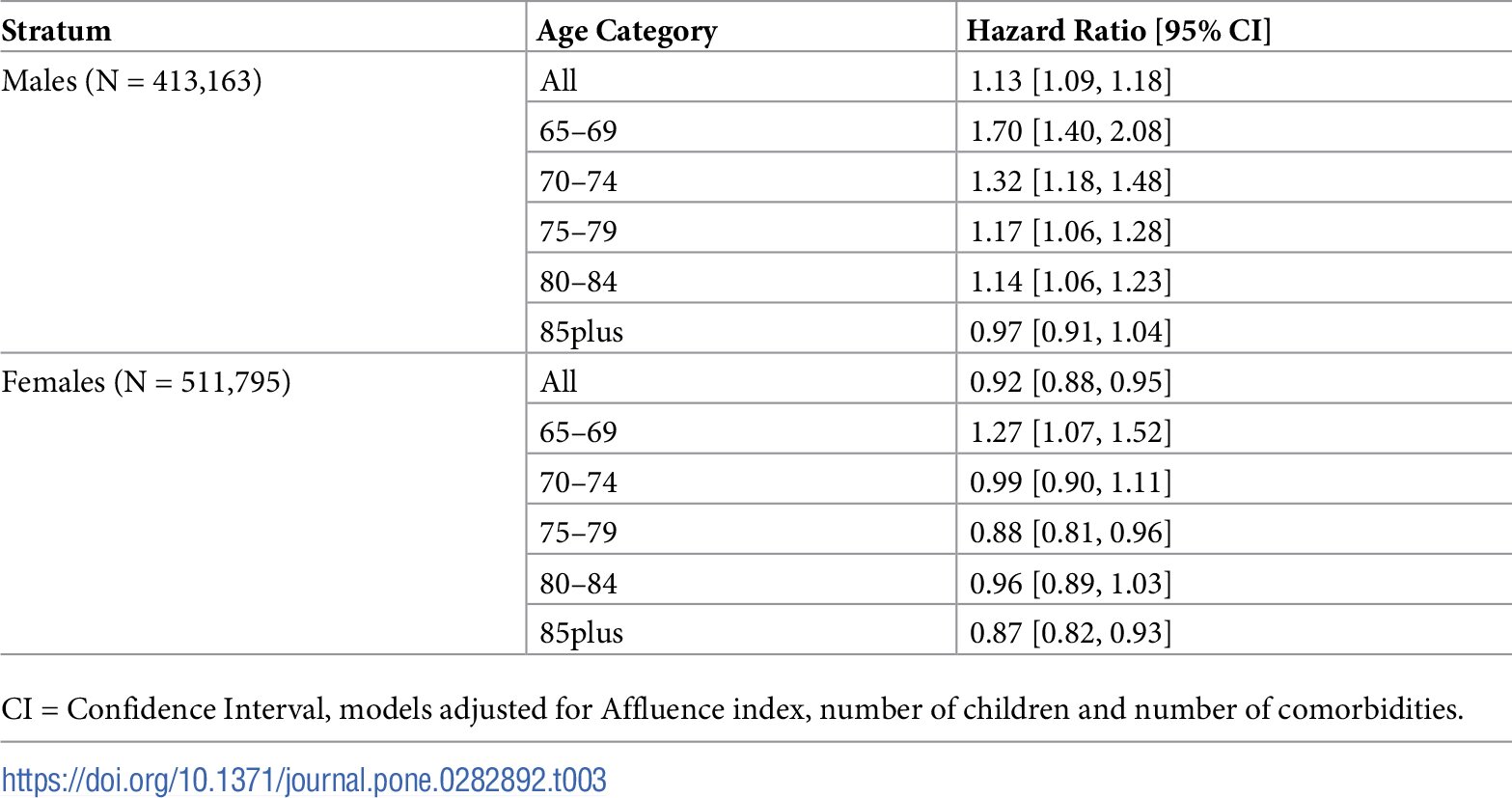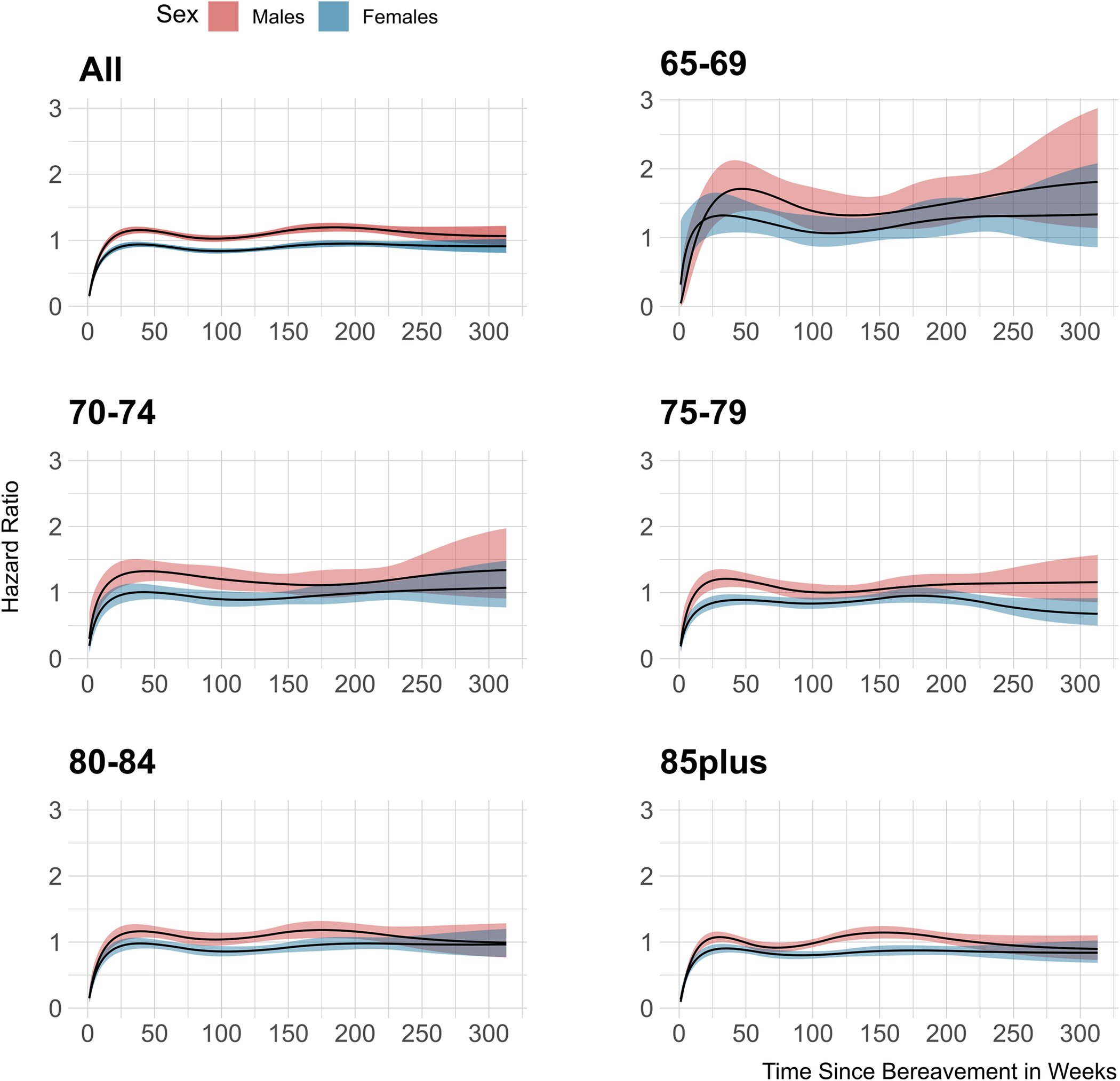 В общей сложности 77 722 человека (~8,4%) пережили утрату, 65,8% из них – женщины. У мужчин потеря близкого человека была связана с увеличением расходов в следующем году, которое составило 42 евро в неделю (95% ДИ, 36–48) больше, чем у группы, не пережившей утрату. Соответствующее увеличение расходов у женщин составило 35 евро в неделю (95% ДИ, 30–40). Рост риска смертности был наиболее выражен в первый год после потери близкого человека, выше у мужчин, чем у женщин, в молодом возрасте и практически отсутствовал у людей старшего возраста. По сравнению с контрольной группой, смертность в течение года после потери супруга была на 70% выше (ОР 1,70 [95% ДИ 1,40–2,08]) у мужчин в возрасте 65–69 лет и оставалась повышенной в течение шести лет. Смертность у женщин в возрасте 65–69 лет была на 27% выше в первый год (ОР 1,27 [1,07–1,52]), а затем нормализовалась. Заключение