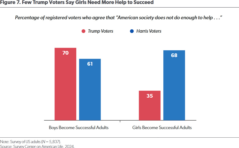 Большинство избирателей, независимо от того, какого кандидата они поддерживают, считают, что американское общество делает недостаточно, чтобы помочь мальчикам стать успешными взрослыми. 70% сторонников Трампа и 61% избирателей Харрис считают, что необходимо больше усилий, чтобы помочь мальчикам стать успешными взрослыми.