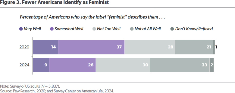 Только 35% считают, что термин «феминистка» описывает её в некоторой степени или очень хорошо, в 2020 таких было 51%