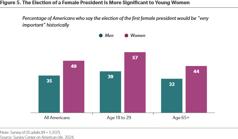 Женщины чаще мужчин считают избрание женщины-президента очень важным историческим событием: почти половина (49%) женщин считают это очень важным, по сравнению с 35% мужчин. Избрание женщины-президента стало бы исключительно важным событием для молодых женщин. Большинство (57%) женщин в возрасте от 18 до 29 лет считают, что было бы очень важно избрать женщину-президента, в то время как менее половины (44%) женщин в возрасте 65 лет и старше говорят то же самое.