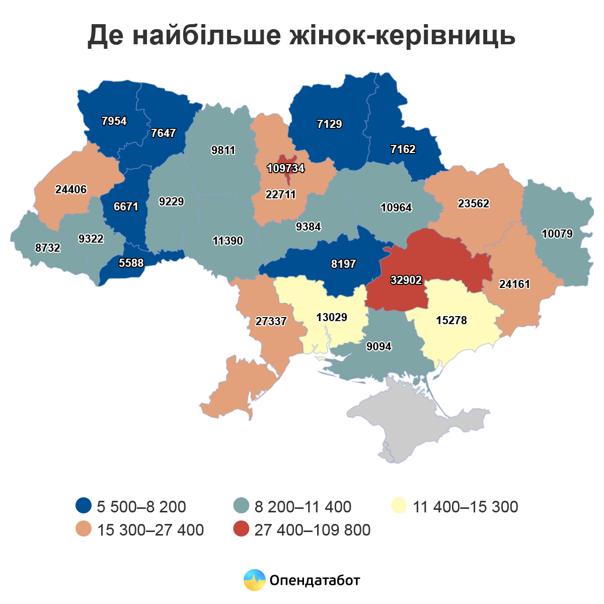 Украина: На 2025 г (четвёртый год войны с Россией и период агрессивной мобилизации мужчин) произошел рост руководителей женщин в частном бизнесе, каждый третий (449 тысяч украинских компаний) бизнес на Украине возглавляет женщина. Руководители женщины преобладают в: образование — 70%; государственное управление и оборона, обязательное социальное страхование — 58%; деятельность в сфере творчества, искусства и развлечений — 58%; туризм — 57%, Больше всего женщин руководителей в прифронтовых областях: в 37% компаний на Донетчине, 35% бизнесов на Херсонщине и 34% — на Луганщине А топ 10 крупнейших компаний которыми руководят женщины имеют совокупный доход 2 триллиона 24 миллиарда гривен [23]