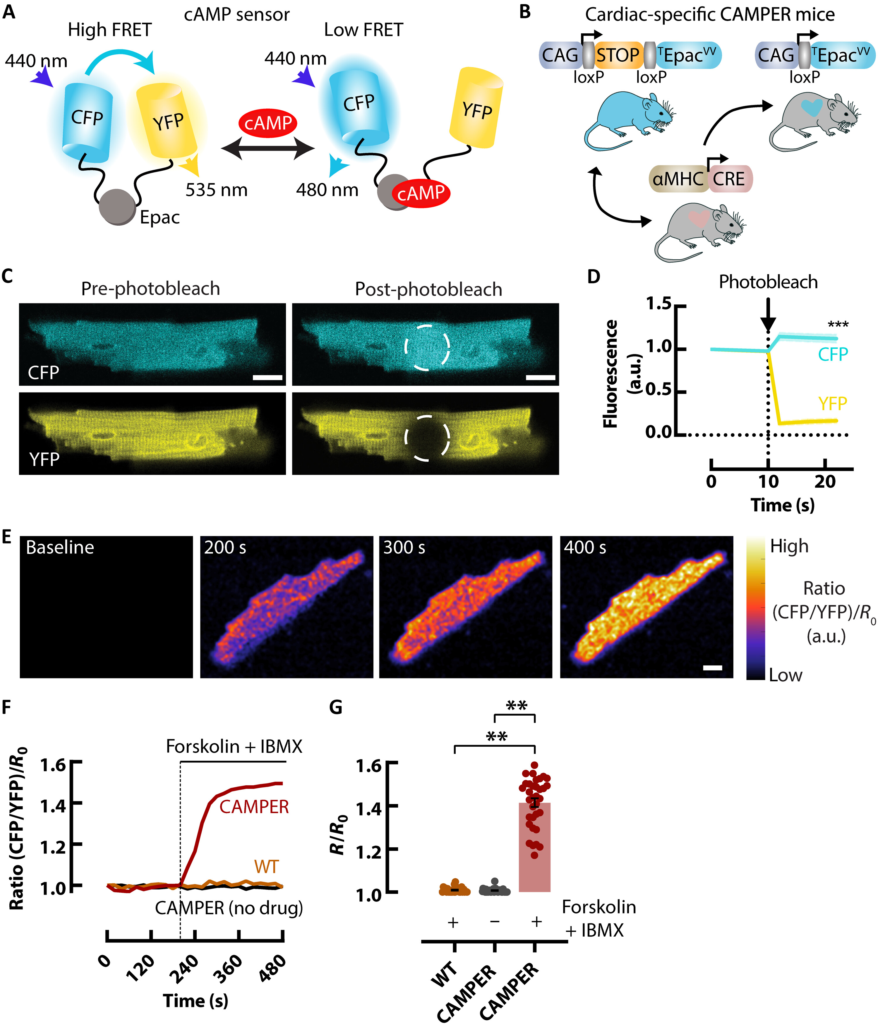 Для оценки симпатических сигнальных реакций в интактном сердце мы использовали условную репортерную мышь CAMPER (22), экспрессирующую биосенсор цАМФ, опосредованный Epac на основе FRET (рис. 1, A и B) (23). Для получения кардиоспецифической экспрессии мы скрестили условную репортерную мышь CAMPER с мышью, экспрессирующей тяжёлую цепь α-миозина с Cre (рис. 1B) (24). Сначала мы проверили способность CAMPER сообщать об активности цАМФ в изолированных желудочковых миоцитах. Свежеизолированные желудочковые миоциты от кардиоспецифических мышей CAMPER демонстрировали интенсивную флуоресценцию цианового флуоресцентного белка (CFP) и жёлтого флуоресцентного белка (YFP) (рис. 1C). После фотообесцвечивания акцептора YFP мы наблюдали увеличение флуоресценции донора CFP на 15 ± 1,1%, что подтверждает эффективный перенос энергии между двумя флуоресцентными белками (рис. 1D). Для дальнейшей валидации биосенсора FRET, специфичного для кардиомиоцитов, к клеткам были добавлены активатор аденилатциклазы широкого спектра форсколин и ингибитор ФДЭ широкого спектра 3-изобутил-1-метилксантин (IBMX) для максимальной активации цАМФ (рис. 1, E–G). Применение форсколина + IBMX к миоцитам CAMPER увеличило соотношение FRET CFP/YFP на 41,4 ± 1,97% по сравнению с отсутствием препарата и применением форсколина + IBMX в кардиомиоцитах дикого типа (рис. 1G). Эти результаты подтверждают широкий динамический диапазон и жизнеспособность данного сенсора для оценки активности цАМФ в сердце мыши.