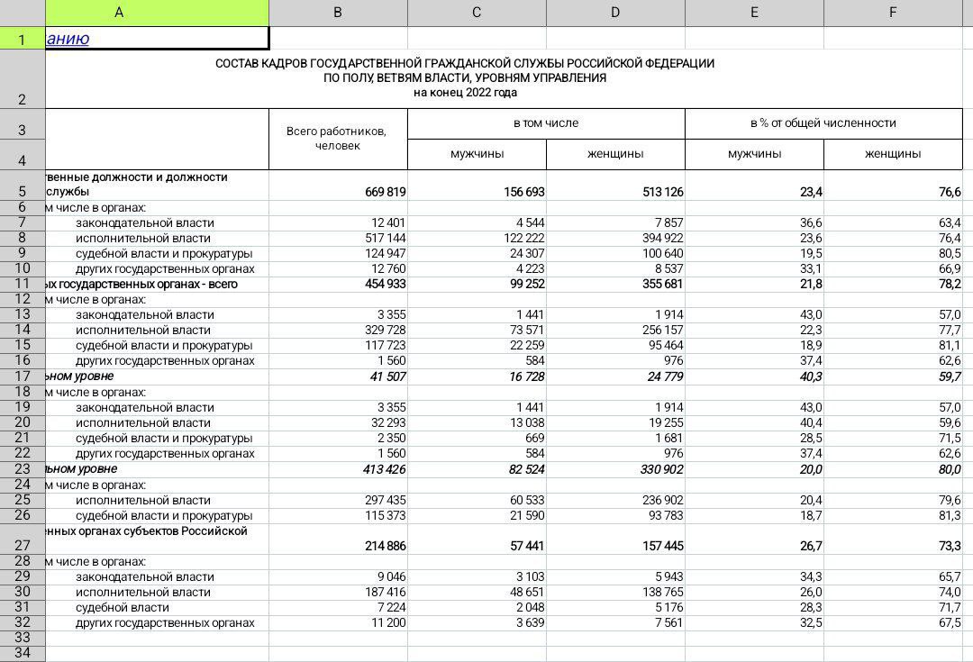 2019: на 2019г женщины занимают от 70 до 80% от общей численности всех ветвей власти России [3] и на 2022г [4], 80% школьного состава; 80% судей и прокуратуры, 71% сотудников исполнительной и 66% законодательной власти [5] Государственная служба, исполнительная и законодательная власть представленна женщинами на 99% воспитателей дошкольнох заведений; 80% преподавателей школы; 80% состава судей и прокуратуры; 71% сотудников исполнительной власти; 66% сотрудников законодательной власти [6] [7]: 99% воспитателей дошкольнох заведений; 80% преподавателей школы; 80% состава судей и прокуратуры; 71% сотудников исполнительной власти; 66% сотрудников законодательной власти. Муниципальные должности: Состав работников, замещавших государственные (муниципальные) должности и должности государственной гражданской (муниципальной) службы, по полу, возрасту, стажу работы, образованию [8]