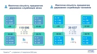 2023: Фактическое количество госслужащих на Украине на 2023г: 119 696 (77%) женщин, 39 637 (33%) - мужчин [10] [11]