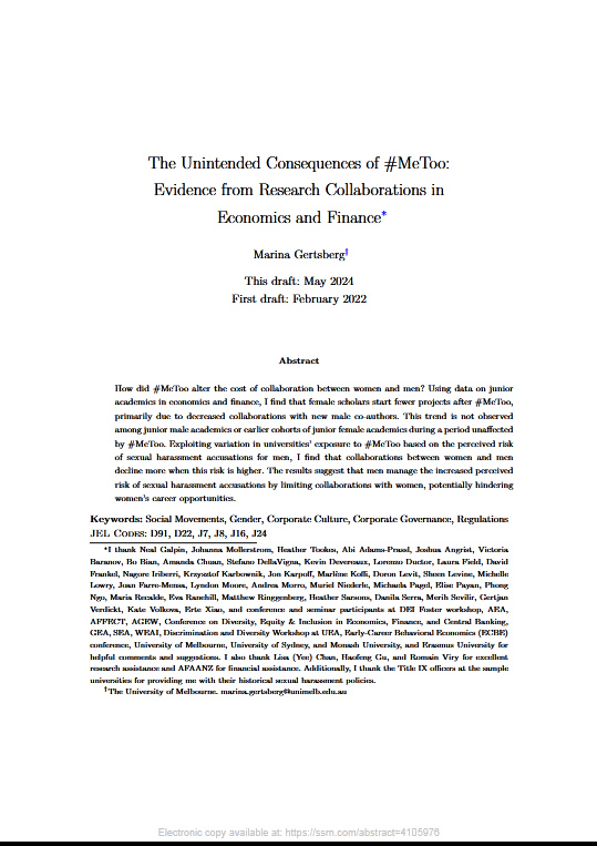 Как #MeToo повлияли на стоимость сотрудничества между женщинами и мужчинами? Используя данные о младших преподавателях в области экономики и финансов, я обнаружила, что женщины-ученые начинают меньше проектов после #MeToo, в первую очередь из-за сокращения сотрудничества с новыми соавторами-мужчинами. Эта тенденция не наблюдается среди младших ученых-мужчин или более ранних когорт молодых ученых-женщин в период, не подверженный влиянию #MeToo.