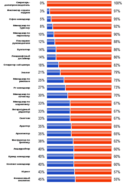 В коммерческой сфере: В России самая женская профессия в коммерческой сфере – секретарь-делопроизводитель, среди претендентов на эту должность нет ни одного мужчины, согласно опубликованному аналогичному исследованию – "100% мужских профессий" – такого аналога у мужчин не нашлось [5]