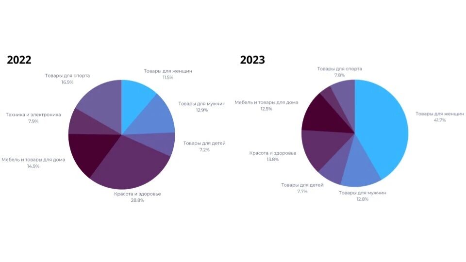 Сервис сравнил первые 2 месяца 2023 года с аналогичными месяцами 2022, среди лидеров покупок женщинами не первом месте Товары для женщин, а на втором Красота и здоровье, а на третьем Товары для мужчин