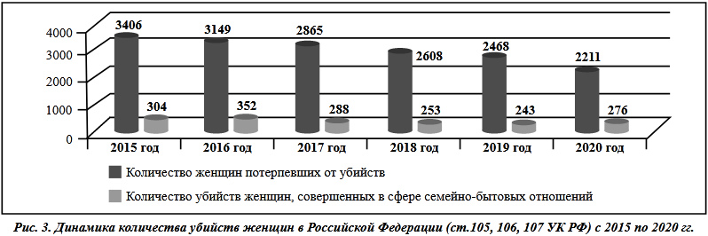 По состоянию на 2020 убийств женщин всего указанно 2211, а в сфере семейно-бытовых отношений указано убийств женщин 276 убийств [28]