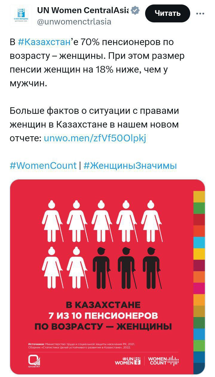 7 из 10 пенсионеров в Казахстане женщины [8], это может свидетельствовать что мужчины не доживают до пенсии или умирают вскоре после неё. Число женщин же среди пенсионеров в России в свою очередь почти в два раза превышает количество мужчин-пенсионеров [9]