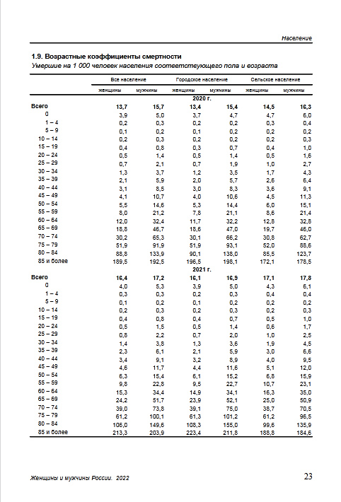 Индекс сверхсмертности мужчин в России на пике равен 4.5, это очень большой показатель, так в 2021 г вице-премьер РФ Татьяна Голикова заявила что в России почти треть смертей в трудоспособном возрасте и 80% умирающих в трудоспособном возрасте в России это мужчины