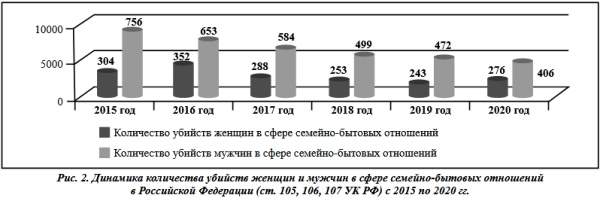 По состоянию на 2020 в сфере семейно-бытовых отношений указано 406 убийств мужчин на 276 женщин [27]