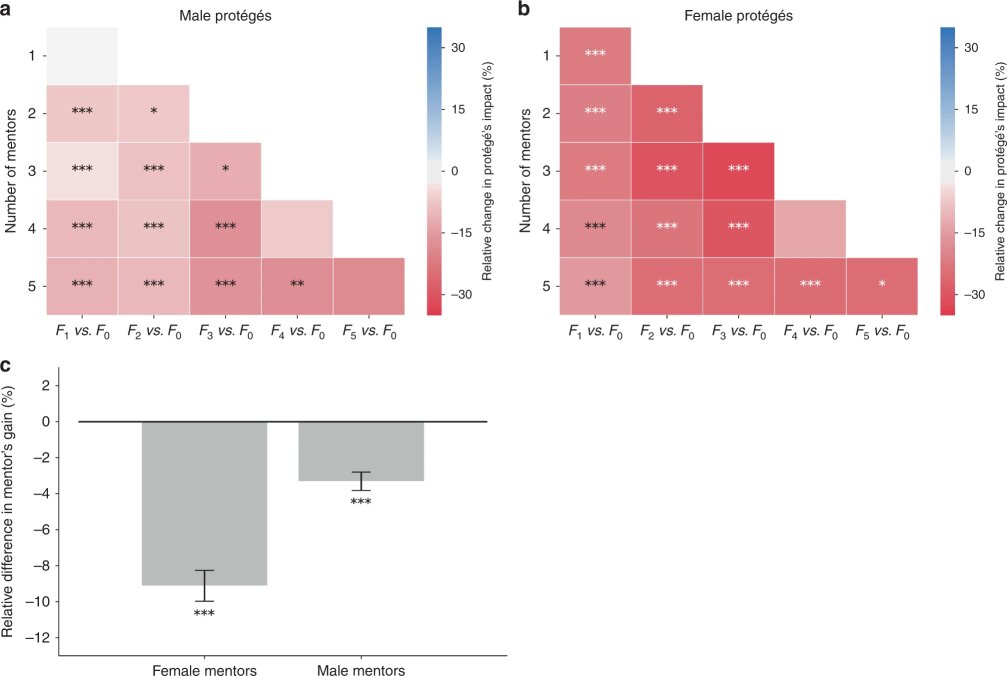 Результаты показали, что, наставляя женщин-протеже вместо мужчин-протеже, женщины-наставники ставят под угрозу свой выигрыш от наставничества и в среднем теряют 18% цитирований в своих наставляемых работах. Что касается мужчин-наставников, их выигрыш, по-видимому, не сильно зависит от того, что вместо мужчин-протеже берут женщин.
