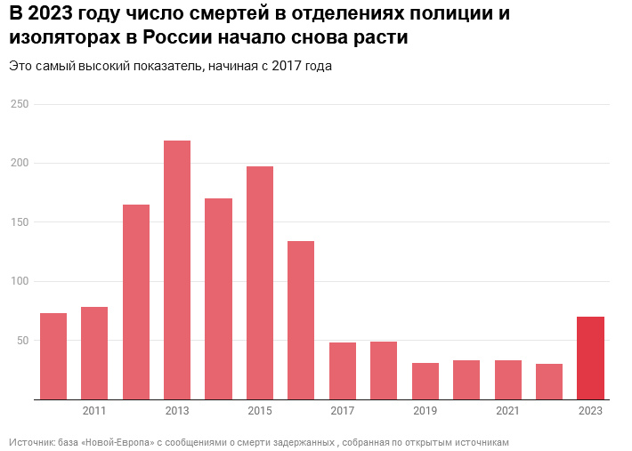 По данным Новой Газеты в 2023 году число смертей в отделениях полиции и изоляторах в России начало снова расти, достигнув самого высокого показателя с 2017г [1] Среди погибших 48 мужчин и 2 женщины [2].