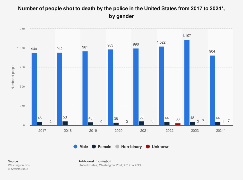 В Соединённых Штатах мужчины погибают от рук полиции чаще, чем женщины. По состоянию на 22 октября 2024 года полиция США застрелила 904 мужчин и 44 женщины. В 2023 году полиция застрелила 1107 мужчин и 48 женщин.