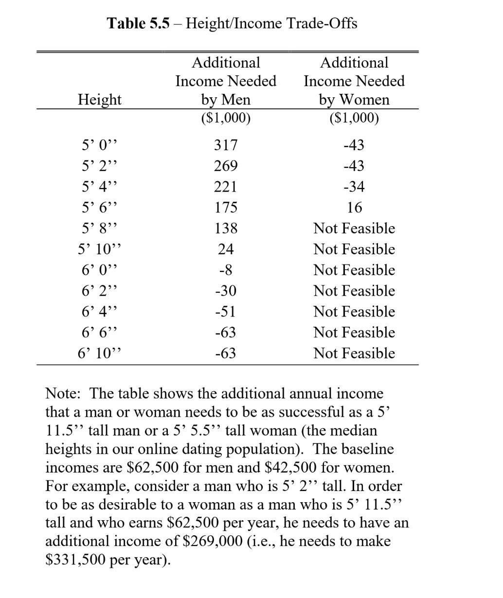 В таблице 5.5 показаны различия между ростом и доходом. Например, мужчине ростом 5 футов 6 дюймов нужно дополнительно 175 000 долларов, чтобы быть таким же желанным, как мужчина ростом примерно 6 футов (средний рост в нашей выборке), который зарабатывает 62 500 долларов в год.