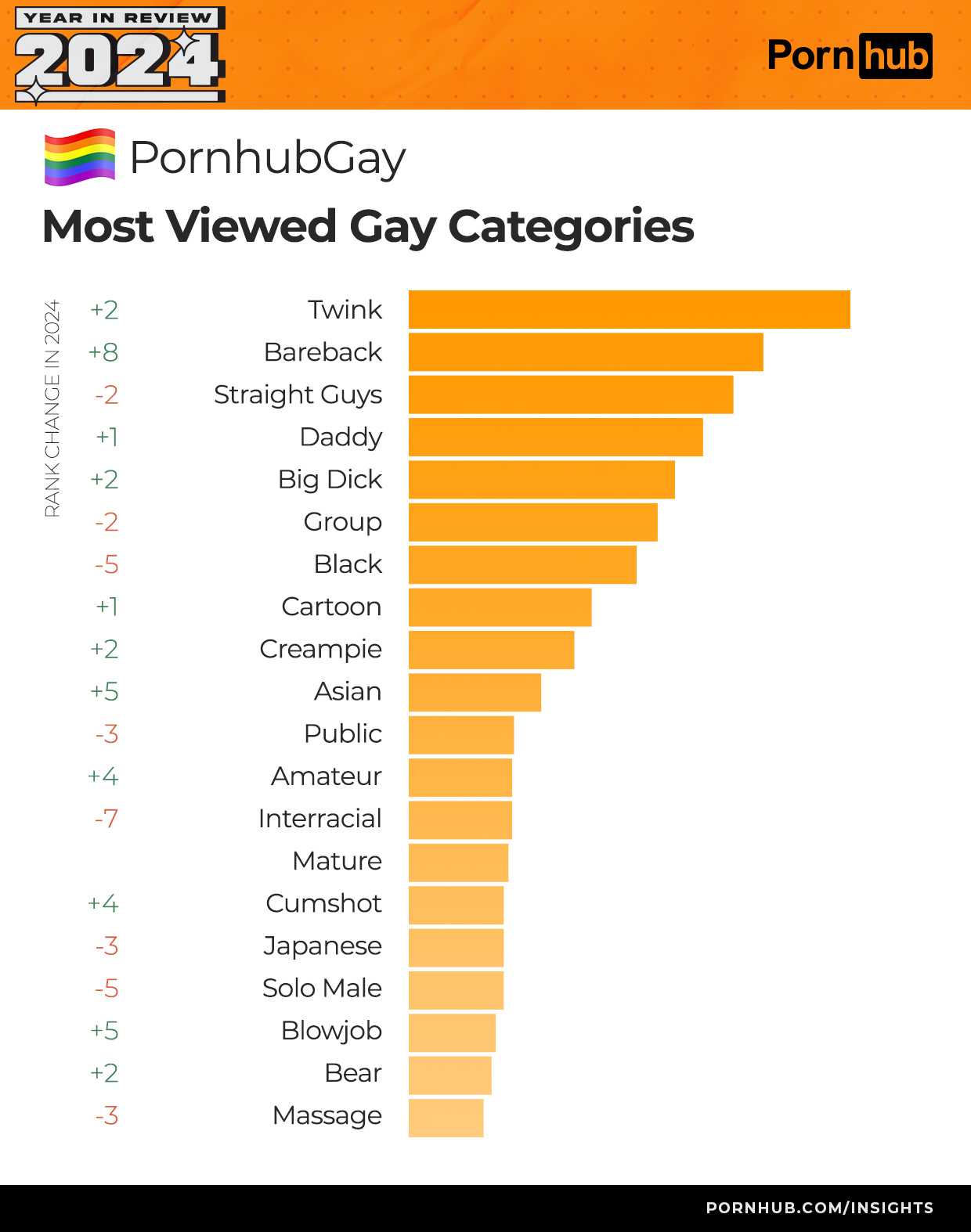 В гей-категории в 2024 году было много активности. Твинки (подростки женственного вида со стройной фигурой и почти отсутсвием волос) обошли некотрые гетеросексуальные категории, поднявшись на 2 позиции в рейтинге самых популярных,