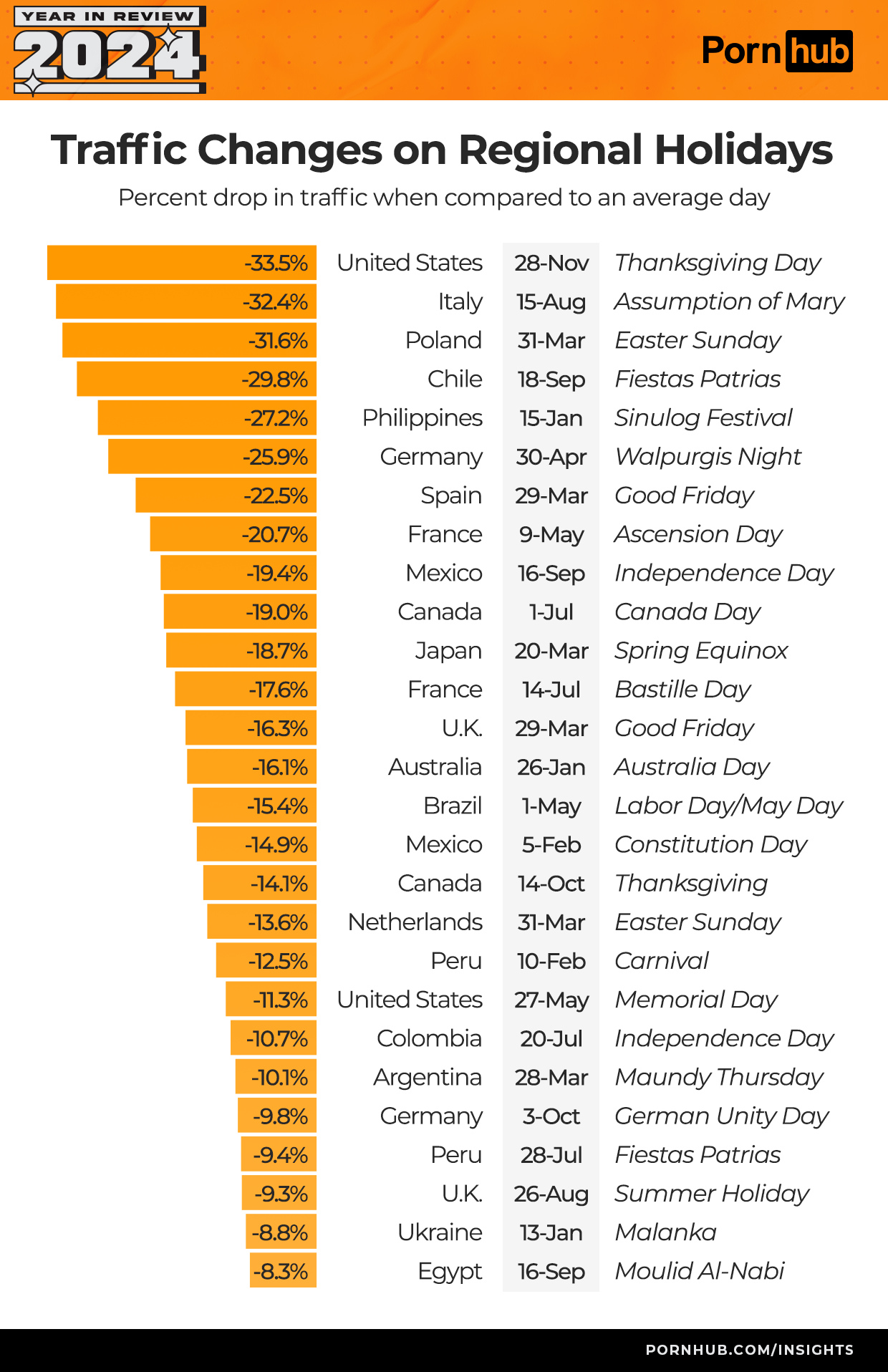 Просмотры порно на Порнхаб в праздничные дни снижается на от -33.5% по США до -8.3% по Егпиту