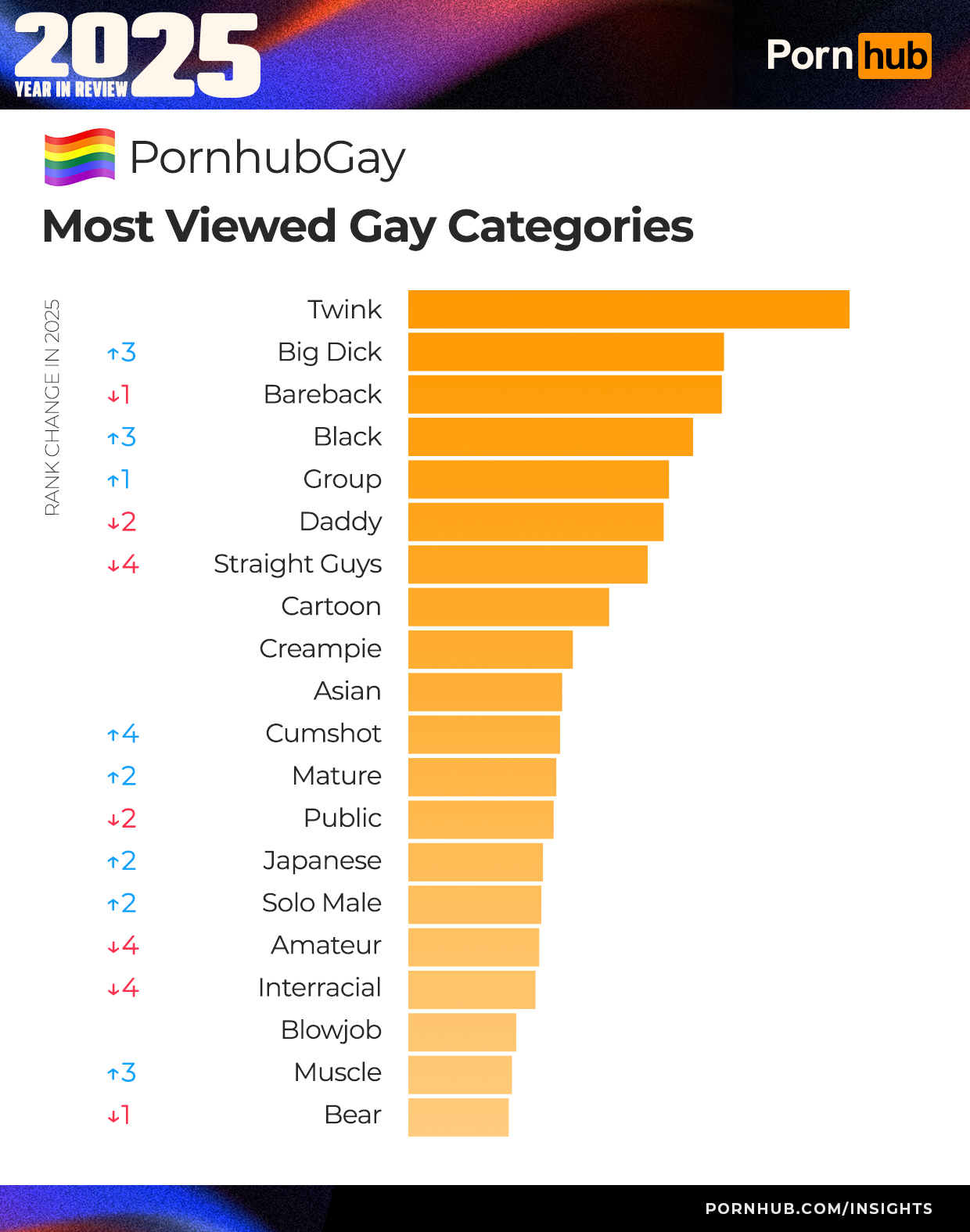 В гей-категории в 2024 году было много активности. Твинки (подростки женственного вида со стройной фигурой и почти отсутсвием волос) обошли некотрые гетеросексуальные категории, поднявшись на 2 позиции в рейтинге самых популярных,
