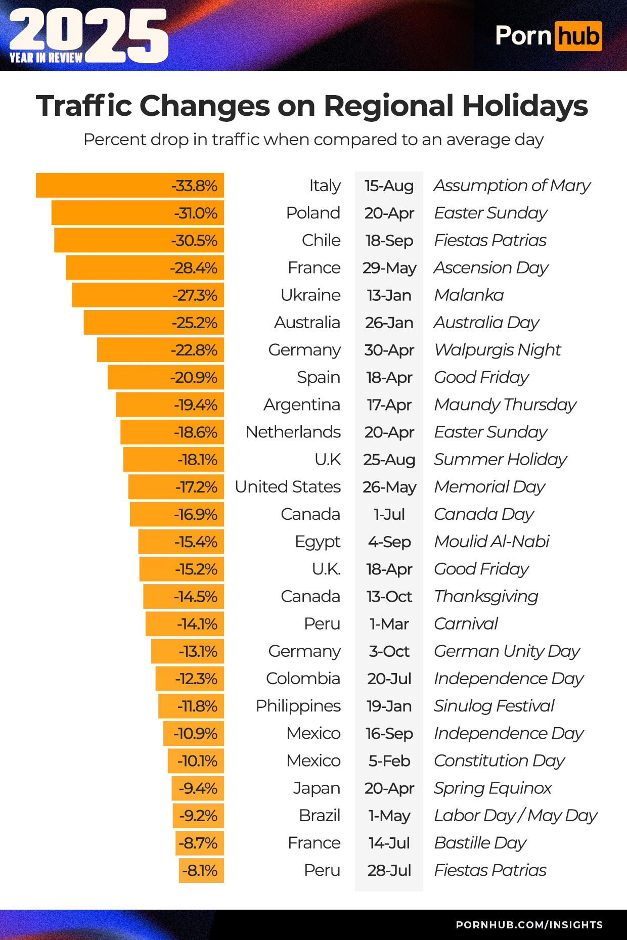 Просмотры порно на Порнхаб в праздничные дни как правило снижается, В Италии зафиксировано самое большое падение трафика среди всех региональных праздников: в день Успения Пресвятой Богородицы, который отмечается 15 августа, трафик упал на 33,8%.В Пасхальное воскресенье 20 апреля в Польше падение трафика составило 31%. А 18 сентября, в Чили, в день Патриации (Fiestas Patrias) трафик упал на 30,5%. Как видно падает трафик в праздники когда онанизм особо амарален, в основном в религиозные.