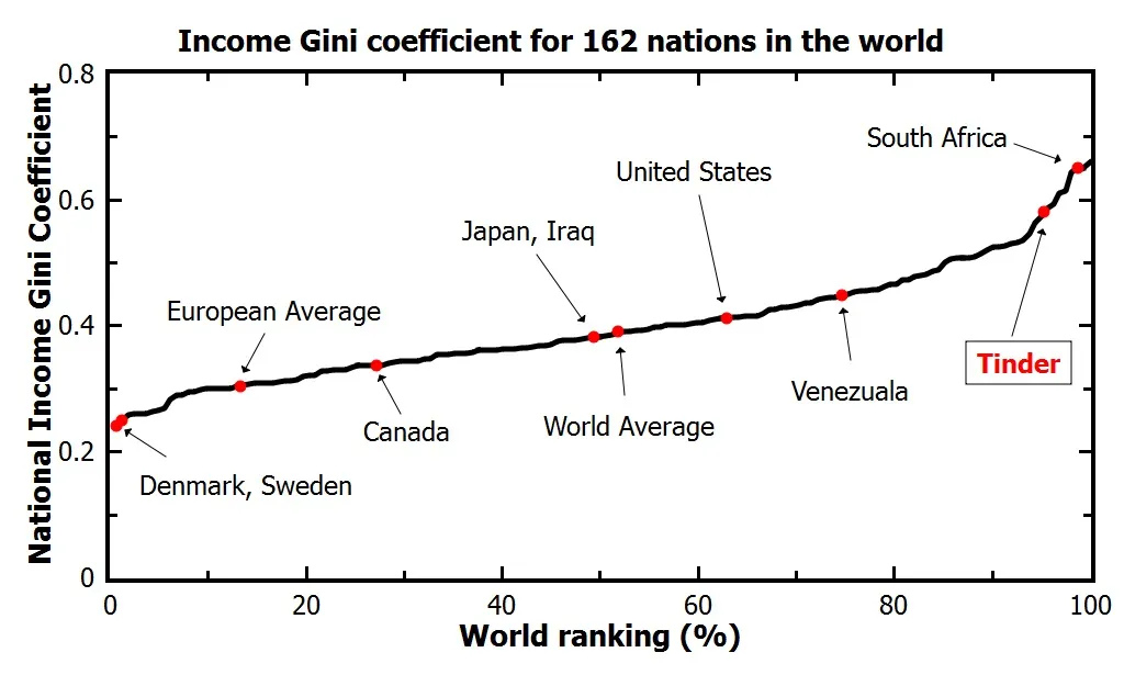 Автор указывает что экономика Tinder имеет более высокий коэффициент Джини, чем в 95,1% стран мира. Единственные страны, у которых коэффициент Джини выше, чем у Tinder, — это Ангола, Гаити, Ботсвана, Намибия, Коморские Острова, Южная Африка, Экваториальная Гвинея и Сейшельские Острова (о которых я никогда раньше не слышал).