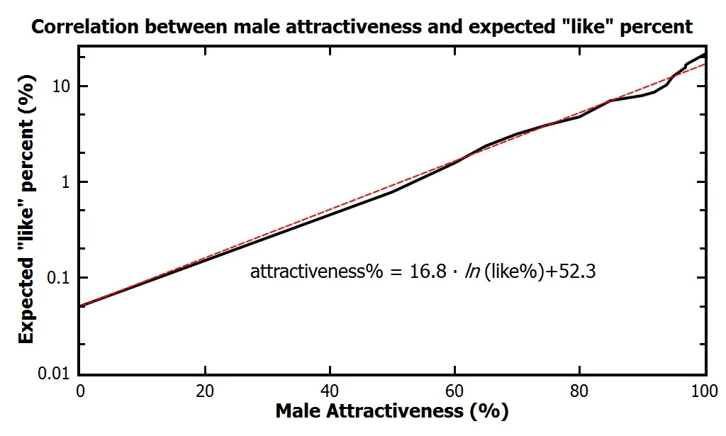 Ось Y представлена в логарифмическом масштабе, а кривая довольно линейна. Это означает, высокую корреляцию с экспоненциальной функцией. Таким образом, вы можете оценить свой уровень привлекательности, если вам «нравятся» все девушки, и отслеживать процент девушек, которым вы «нравитесь» в ответ, с помощью простого уравнения: